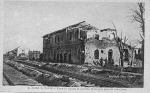 Simboli e cimeli ricordano l’esodo improvviso e necessario di migliaia di persone. Lunghissime file di carriaggi attraversarono il ponte, la popolazione abbandonò le proprie cose ad un triste destino, le case con la chiave sulla toppa del portone. Le bombe “amiche” sconvolsero il centro cittadino per un anno intero, sventrando edifici, sconquassando strade ed impianti, rendendo ad un ammasso di macerie persino il cimitero. E proprio sull’argine che separa il centro urbano dal vicinissimo Piave, lì correvano le trincee. Argini altissimi costruiti per difendere il paese dalle acque di piena che quasi annualmente tentavano di invaderne l’intero territorio. Ad un tempo luogo di difesa e di assalto, le trincee disposte in sequenza infinita e negli argini si scavarono anche gallerie per depositi, magazzini, casematte.